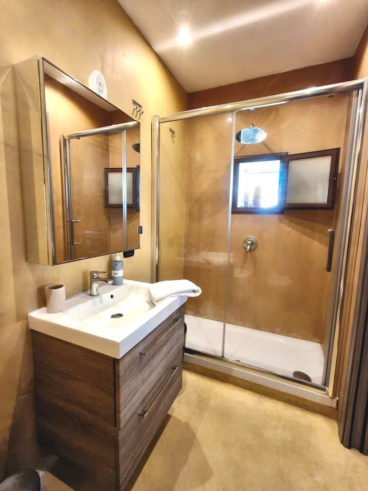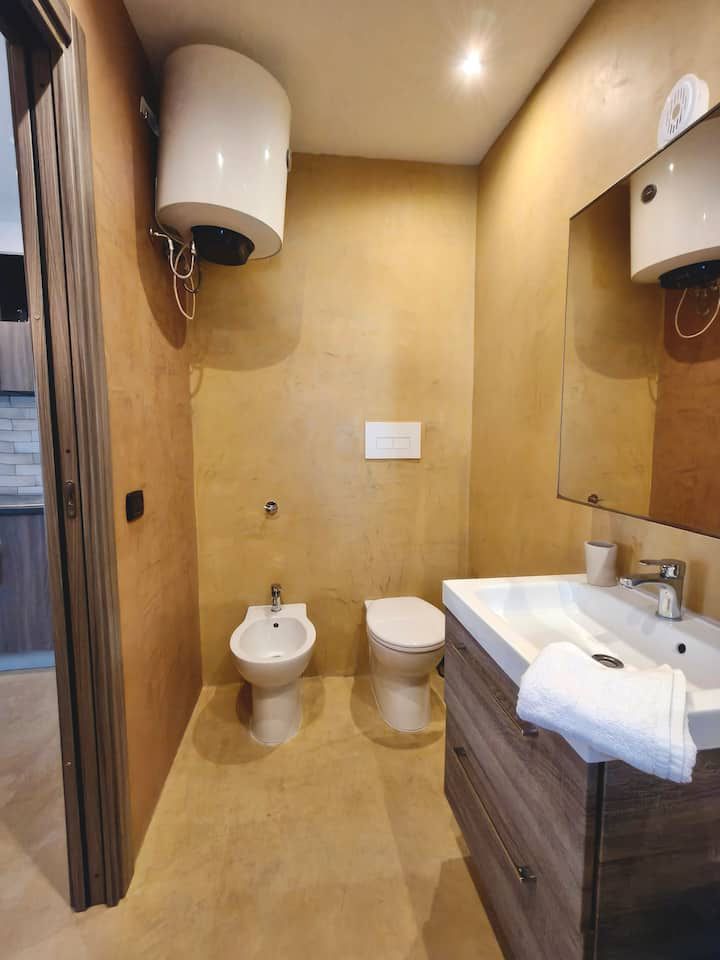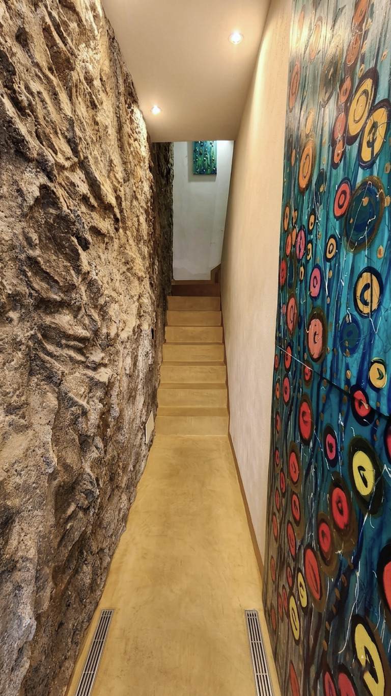 Al piano terra si trova l’ingresso con una camera e un bagno con doccia finestrato, oltre a un piccolo spazio esterno che aggiunge valore e funzionalità. Una scala interna collega i piani superiori, dove gli ambienti si sviluppano con armonia.