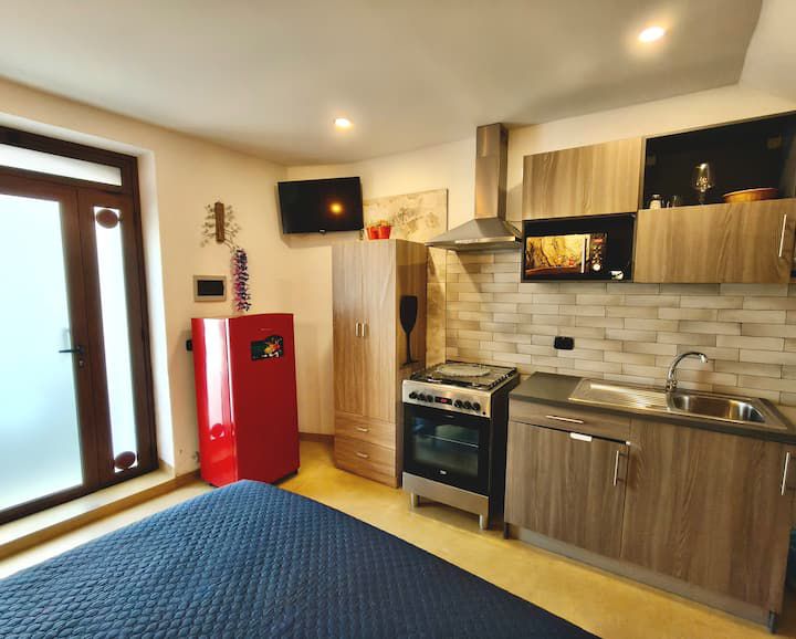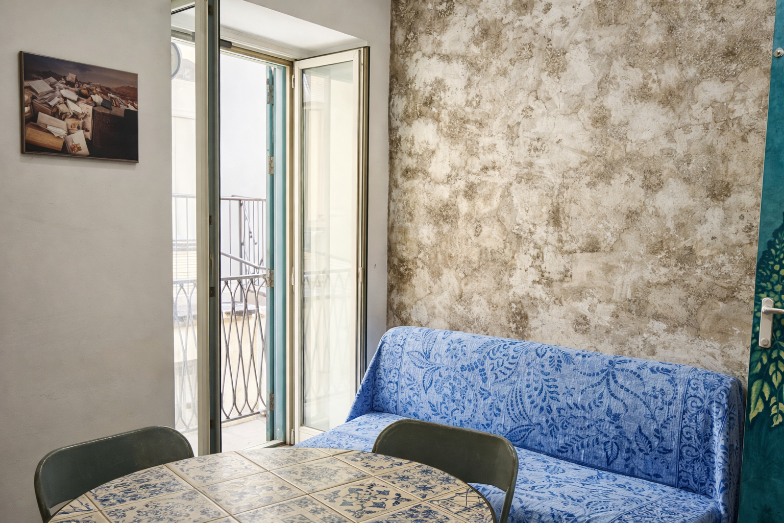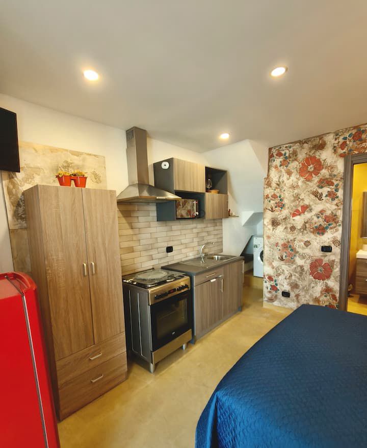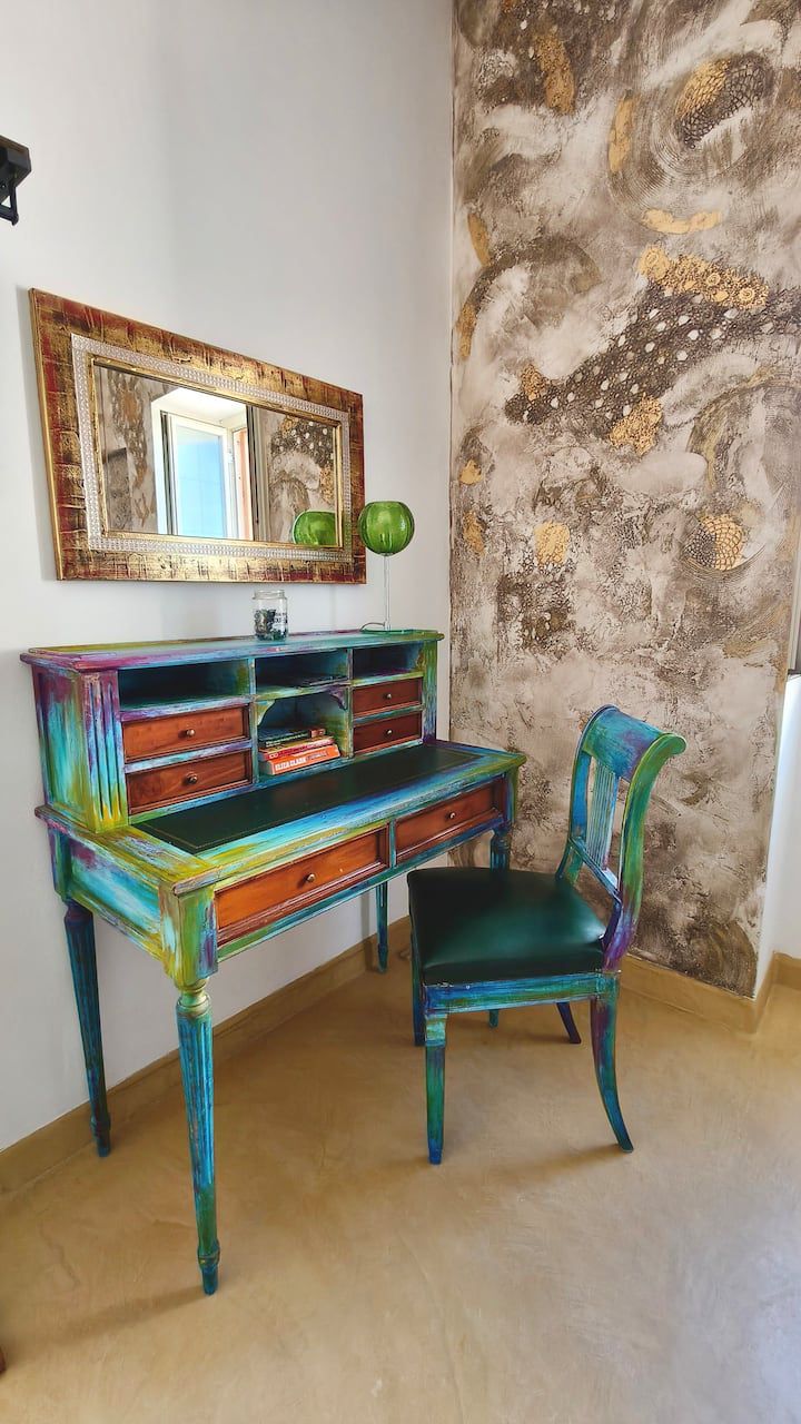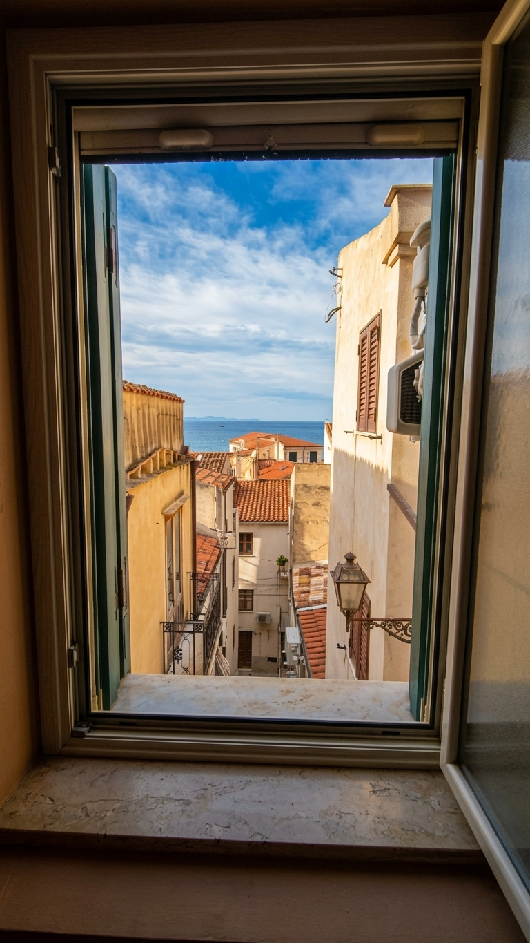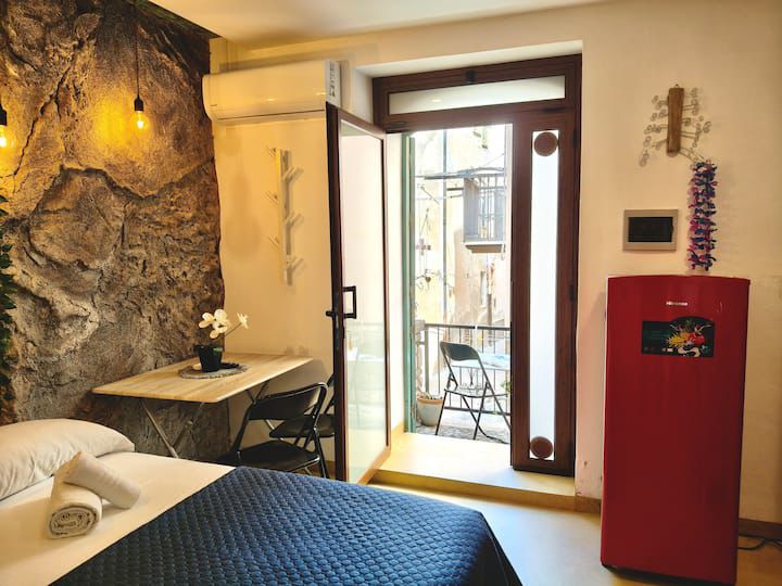 Al secondo piano si trova la camera matrimoniale, luminosa e riservata, con balcone e aperture panoramiche che regalano viste caratteristiche sui tetti del centro storico delle torri della Cattedrale e, in alcuni punti, sul profilo del mare.